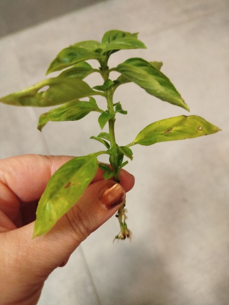 Ik had nog rucola- en sla-zaadjes liggen, plus één laatste beetje basilicum dat buiten eigenlijk geen schijn van kans meer had. Iemand zei ooit dat een basilicumtakje gewoon weer wortels maakt als je het in een glaasje water zet. Tijd om het te proberen!