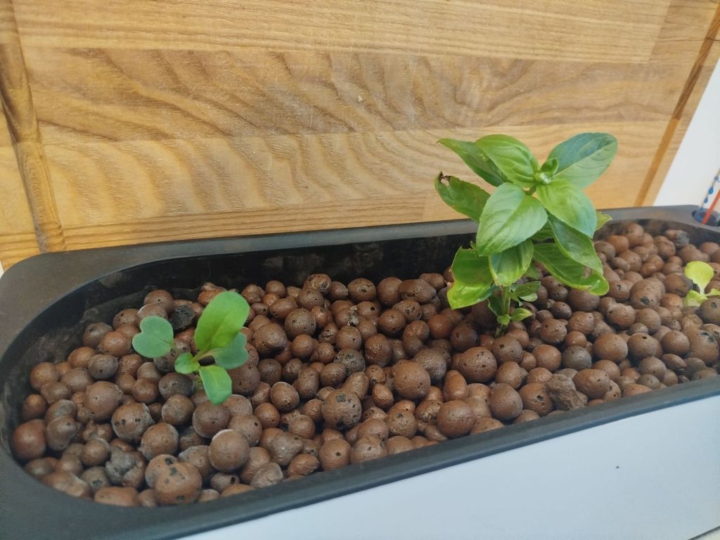 De basilicum, rucola en sla probeer ik binnen voor het raam te laten groeien zonder aarde. Ik gebruik hydrokorrels, water en een beetje voeding. Het klinkt ingewikkelder dan het is: planten op water in plaats van aarde.